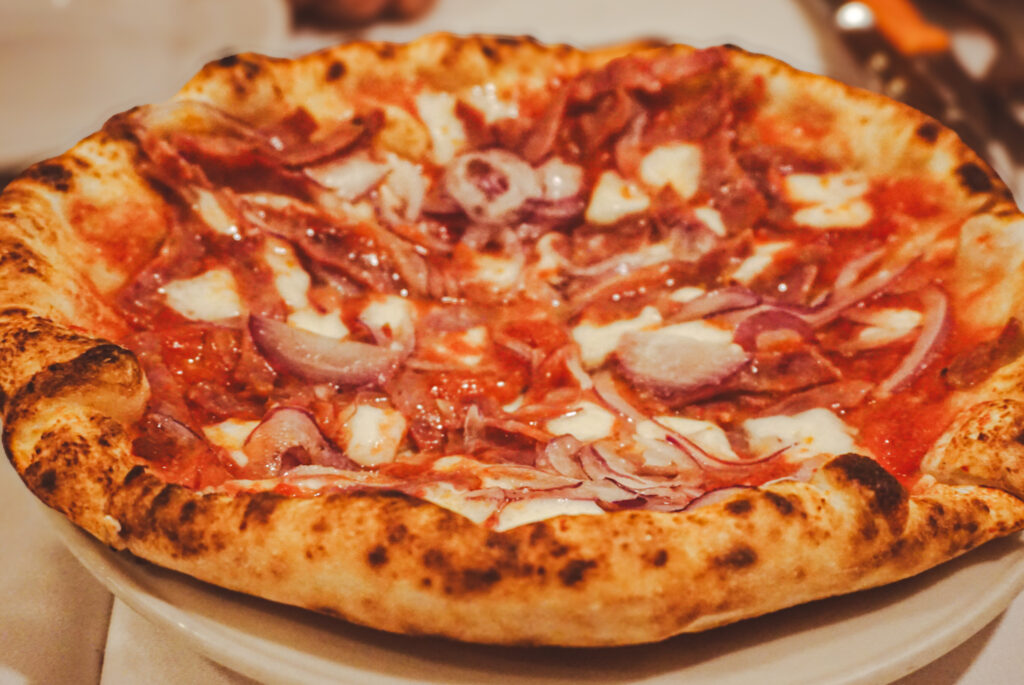 シャキッとした食感を残した赤玉ねぎに、サラミとチーズ。ごくシンプルな具材ながらそれぞれが調和し、生地そのもののおいしさと相まって、いくらでも食べられそうなピッツァが登場しました!