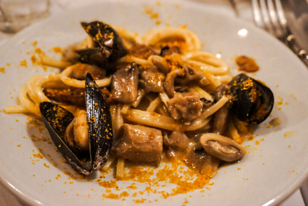 ムール貝といろいろキノコのカラスミがけスパゲッティ